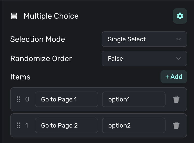 To add more choices, click + Add in the component editor. You can reorder choices by dragging them.