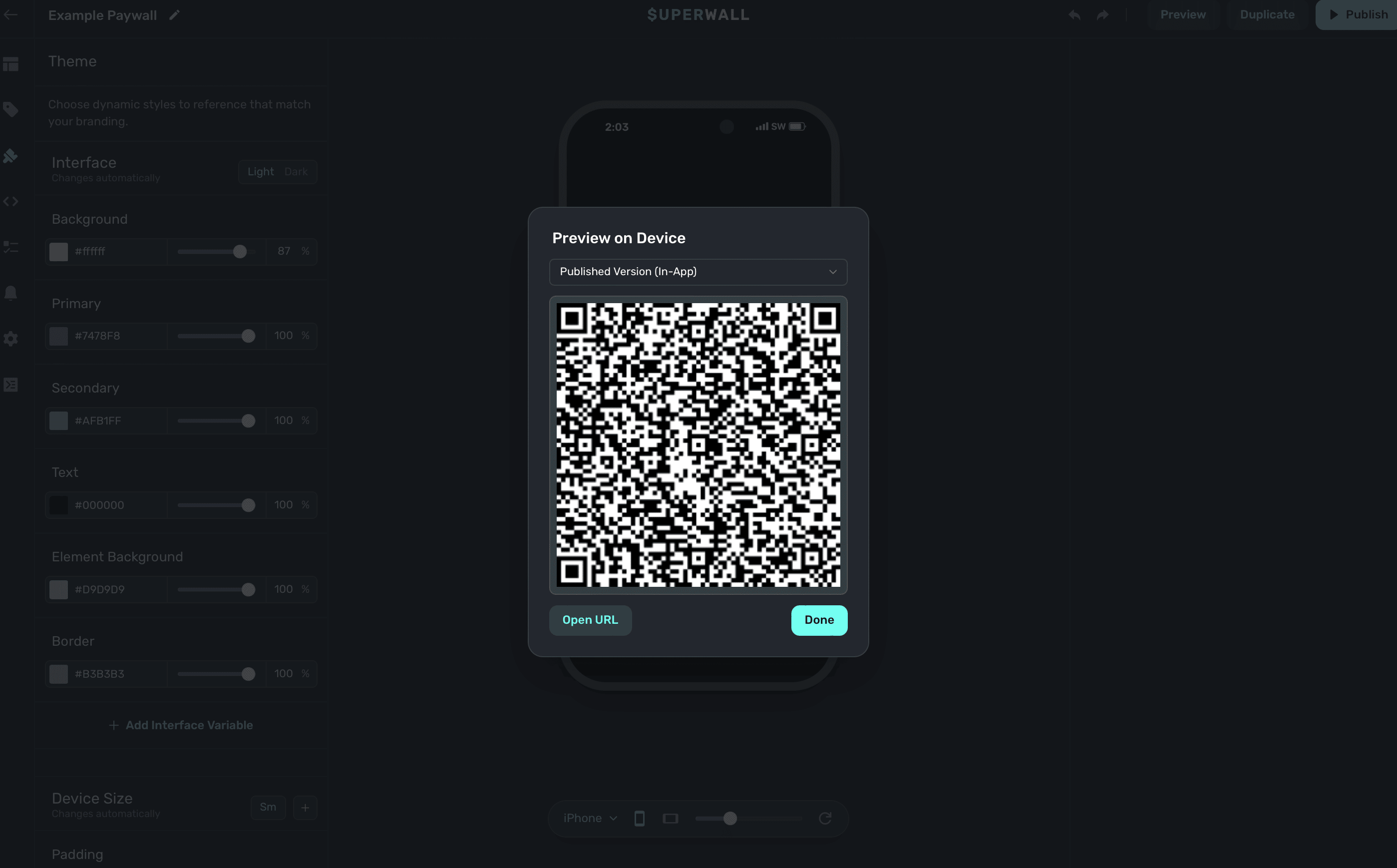 Next, open your paywall from the dashboard and click Preview. You'll see a QR code appear in a pop-up:
