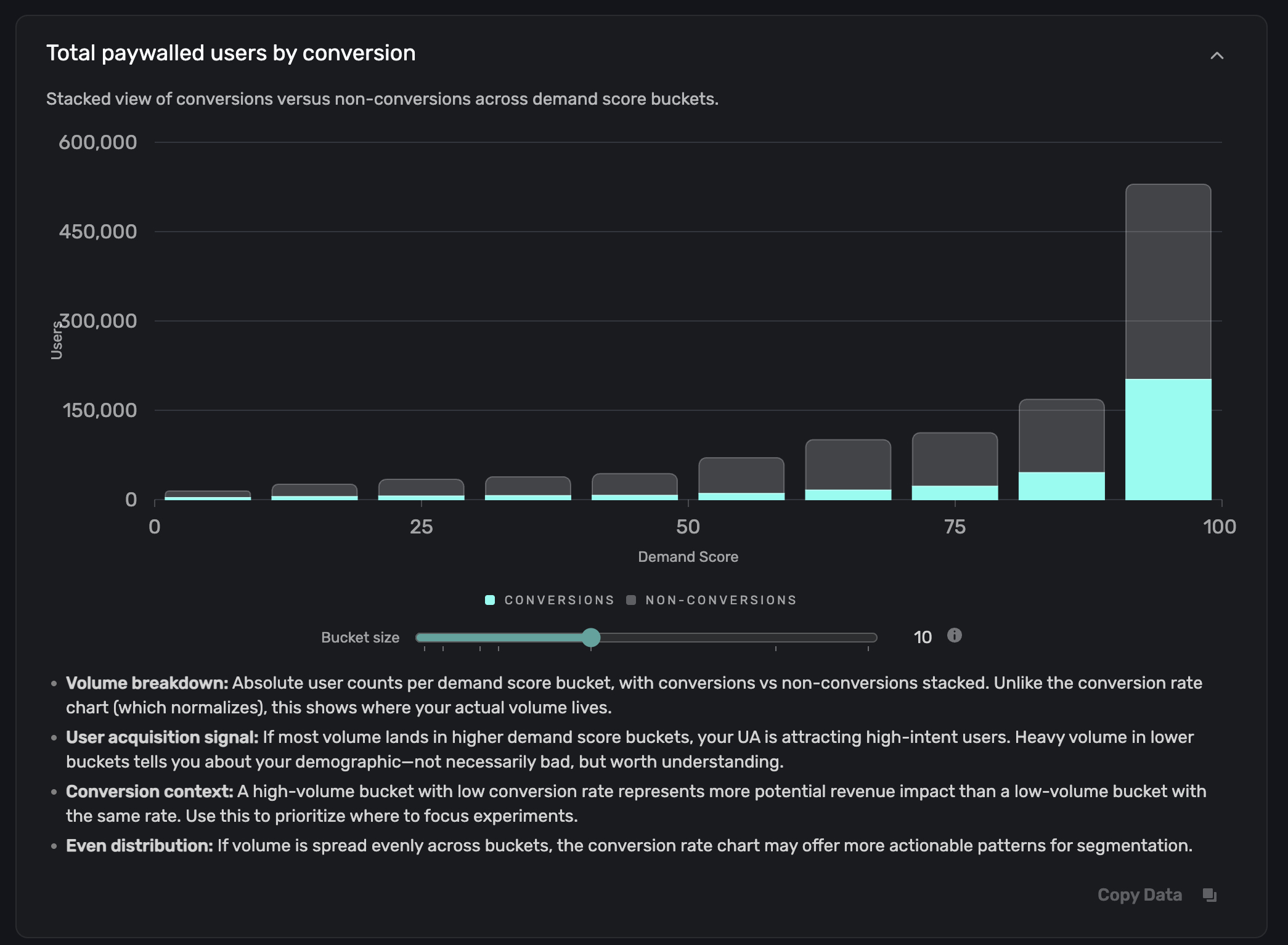 The Conversion Rate chart shows the observed conversion rate for each demand score bucket. Higher-demand buckets should generally have higher conversion rates. If they don't, it may point to a paywall or offer issue in that range.