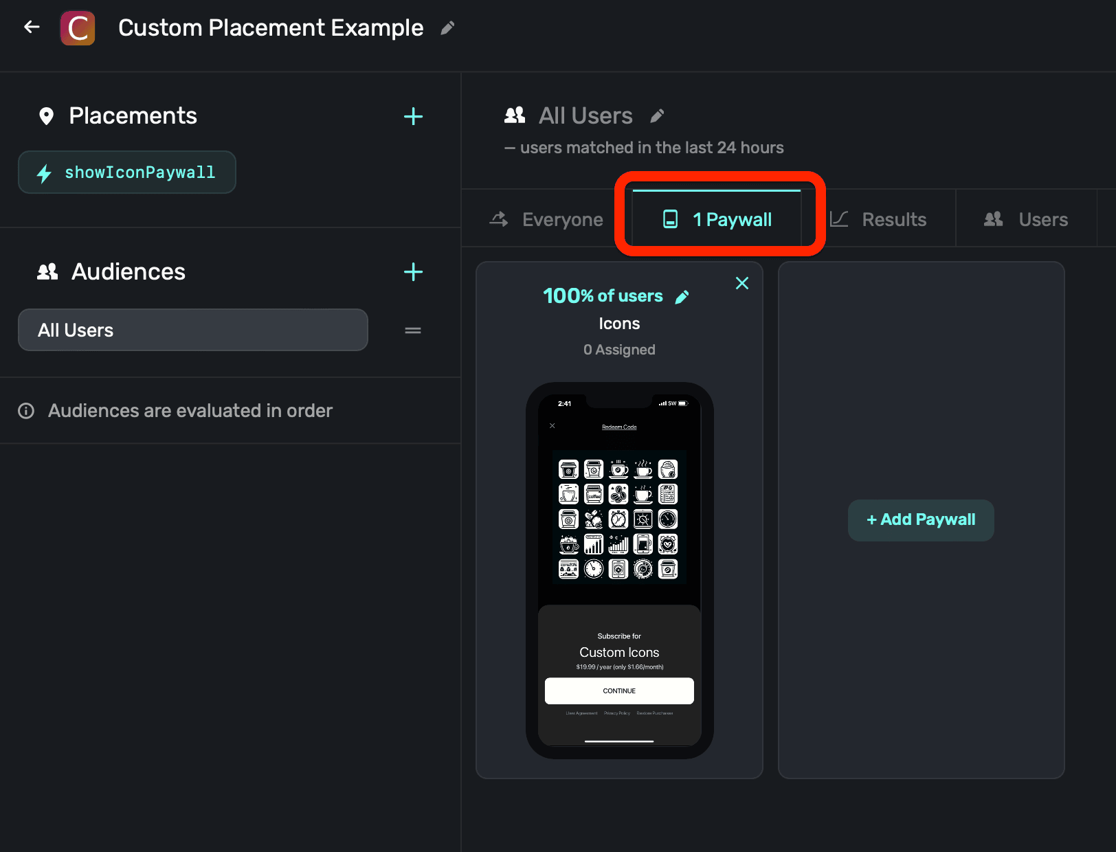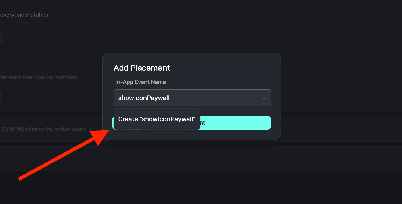 In your new campaign, add a new placement that matches the name of your custom action you added in step one. For us, that's showIconPaywall: