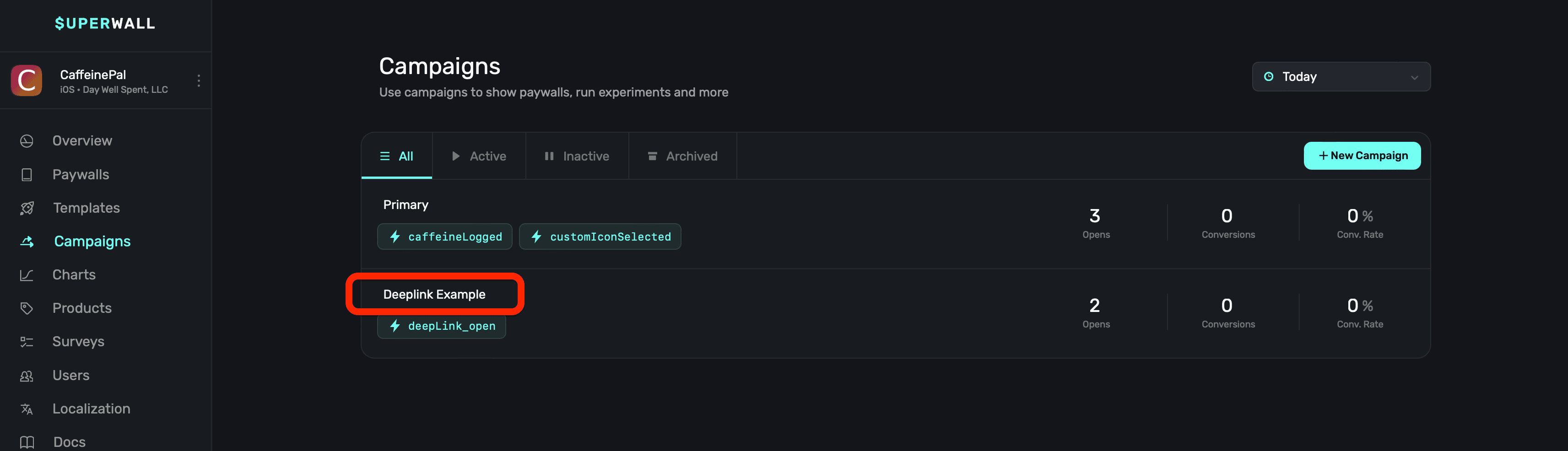 Create a new campaign specifically for this purpose, here — it's called "Deeplink Example":