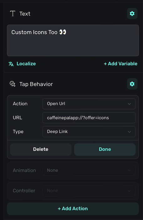 3. For the URL, use your deep link scheme from step one, and then append a parameter which will represent which other paywall to present. This is specific to your app, but here — offer is the key and icons is the value. Your resulting URL should be constructed like this: deepLinkScheme://?someKey=someValue.