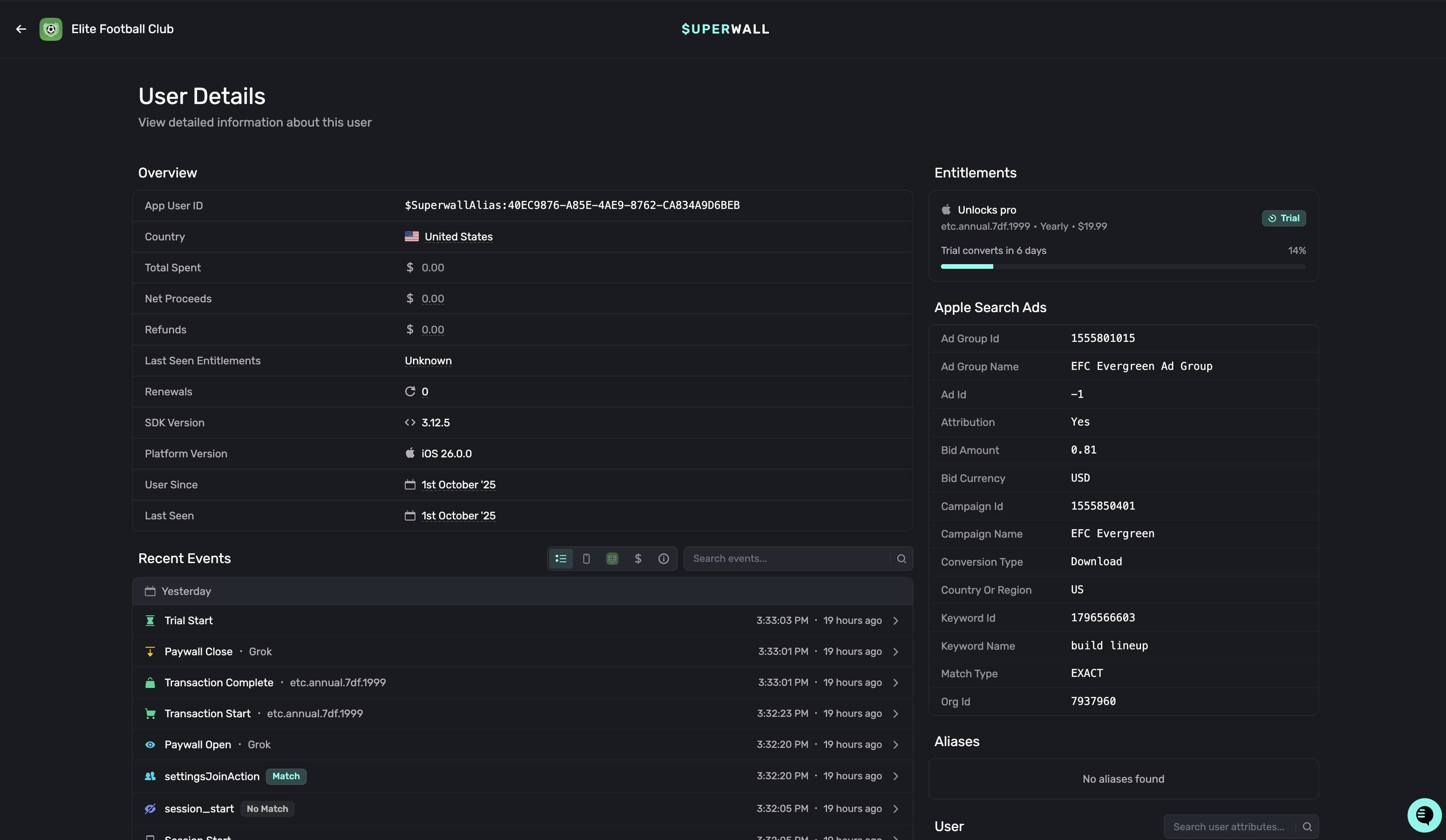 - Aliases: Any alias that Superwall has assigned the user will show here. Read more about how user aliases are created here.