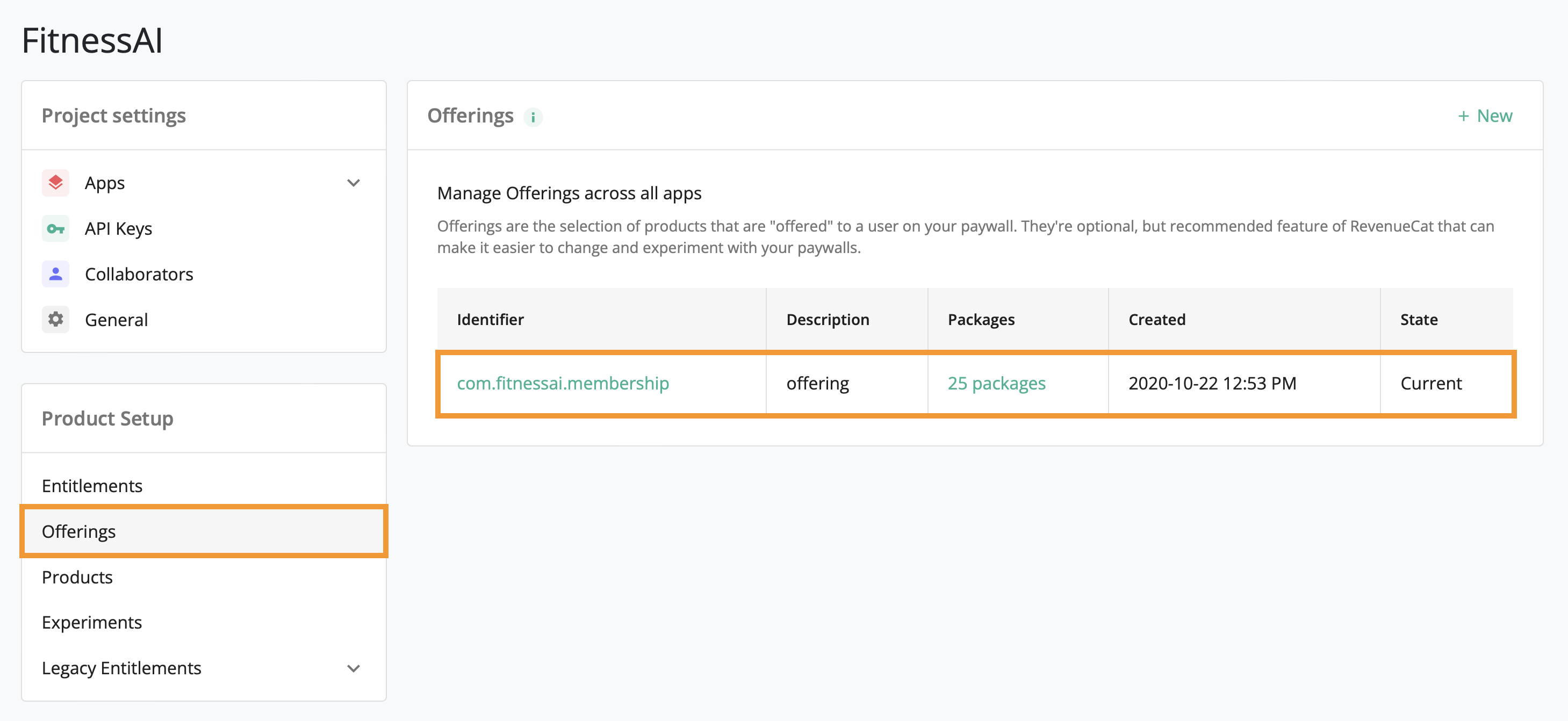 Then, add your RevenueCat Public API Key inside of settings by clicking the cog wheel icon in the navigation bar from any page and selecting Settings. Paste your API key then click Update Application: