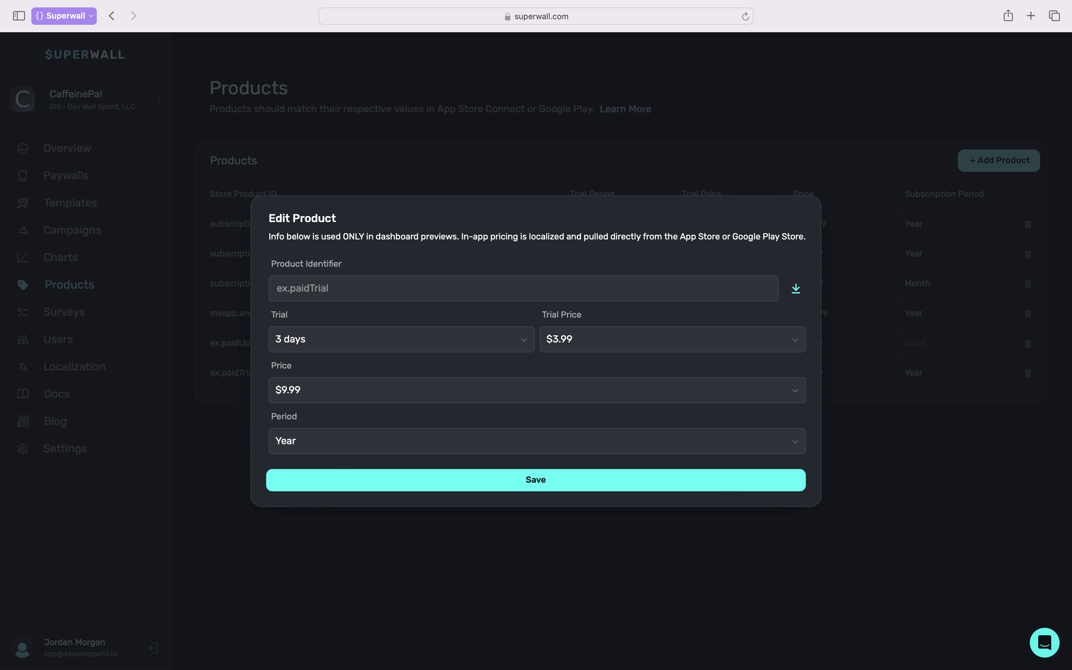 If you're using a StoreKit Configuration file, pricing information will come from there during local testing. Therefore, it's important to keep your StoreKit Configuration file, Superwall, and the App Store products all in sync. Follow our Setting up StoreKit testing guide for more information.