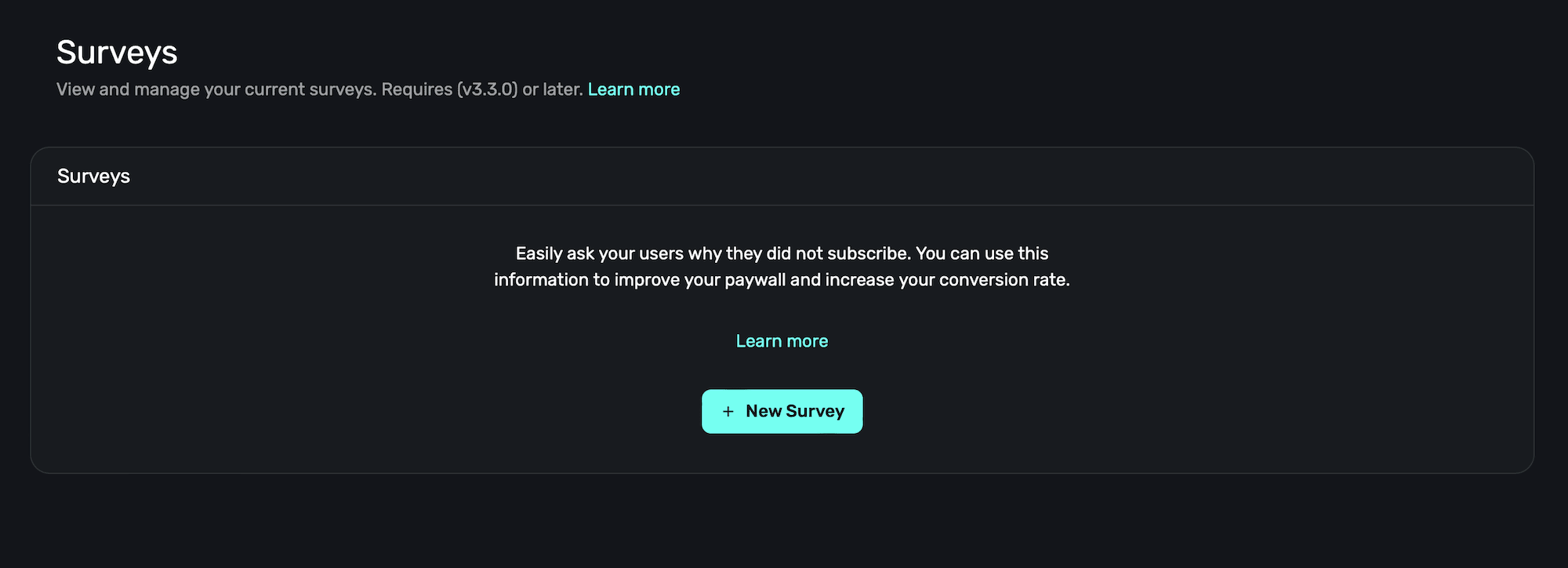 Adding a paywall exit or post-purchase survey is a great way to boost conversion and get feedback on why users declined or purchased from your paywall. Once you've configured a survey, it can be attached to multiple paywalls. A user will only ever see a specific survey once unless you reset its responses.