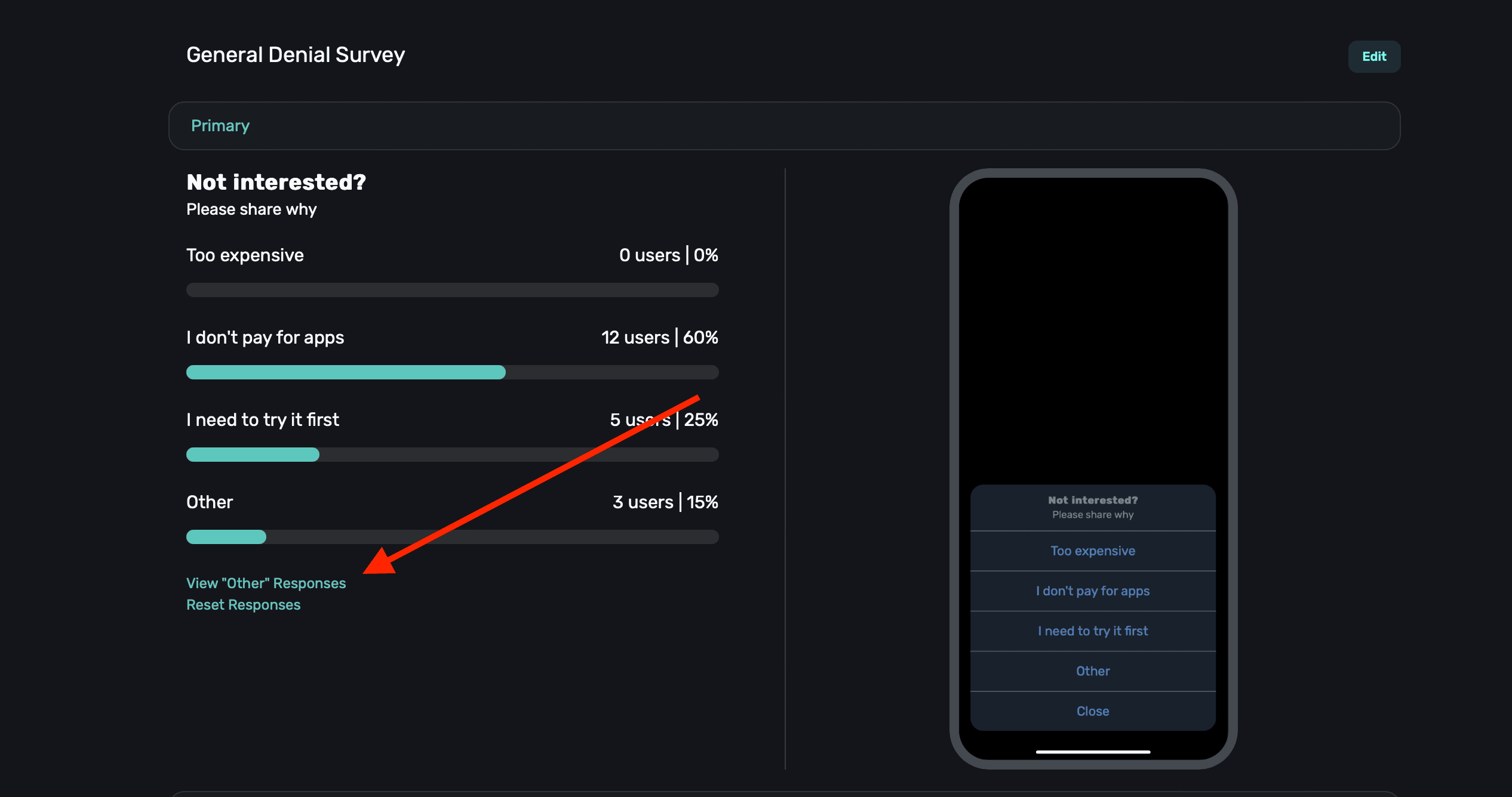 The "Other" button lets users type in a free text field. This is useful if users are willing to provide more context about why they declined (or purchased from) the paywall. If this is used, it will always display as the last option in the survey.
