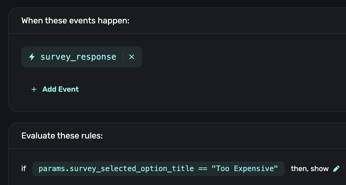 You can combine this with rules to show a paywall whenever a survey response is recorded or when the user gives a specific response: