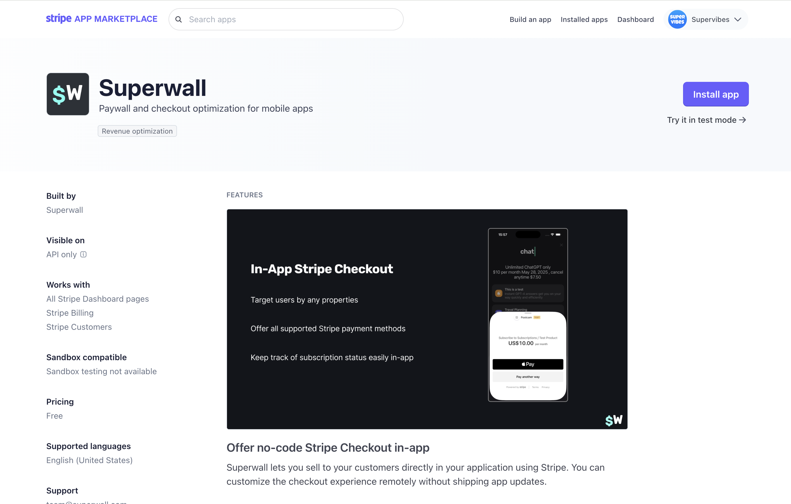 Navigate to the Superwall app in your Stripe dashboard. If already installed, find it under Apps: