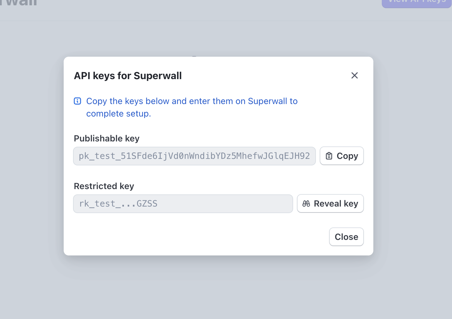 The Superwall Stripe app provides both live and test mode keys. Make sure you're in the correct mode in your Stripe dashboard when copying keys.